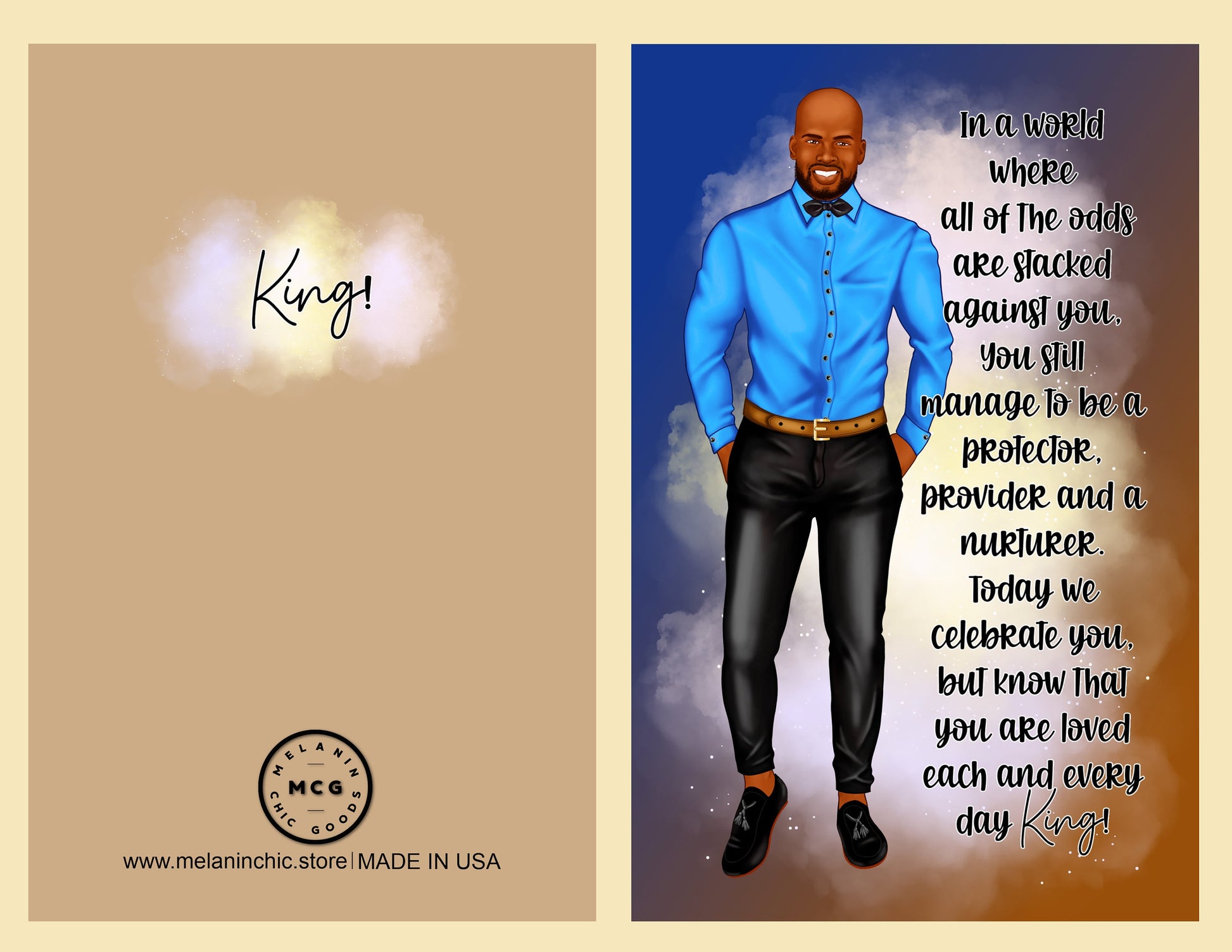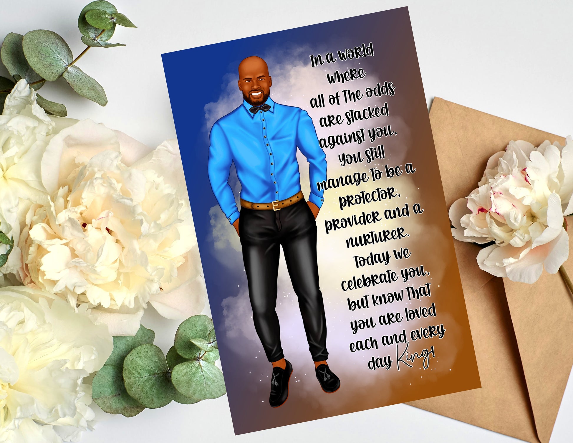 Say Happy Father's Day without sacrificing style. Our African American greeting cards are a representation of who you are and how your feeling at the moment. Our cards are blank on the inside, so that you can write a personal message from the heart. Our greeting cards come as (1), (6) or (12) Count. If you would like different styles and tones; please message me the amount for each style and tone, and include your order# that you will receive when you check out. You will have the option to enter personalization information for most cards. Our cards are Full Size. The cards measure 5.5 x 8.5 folded, and 8.5 x 11 inches unfolded. Most of our cards are printed on gloss cardstock, and some are printed on linen cardstock. Our cards are great for Birthdays, Christmas, Anniversaries, Mother's Day, Father's Day, Graduation, Valentine's Day, and many more celebrations. Our greeting cards are great gifts to give to your Mother's, Father's, Brothers, Sisters, Children, Grandchildren, Grandparents,Friends and Co-workers. Give the gift of style and representation for that speacial event.